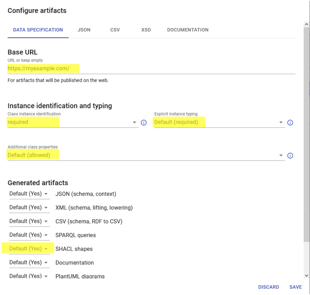 - Generated artifacts (SHACL Shapes) - Has 2 options: Yes, No.