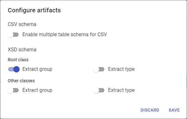 These two settings can be configured separately for the root class and for the other classes. This separation is useful when the schema is reused in other specifications, because the root class is identified via its group’s name. In that case, it is necessary to turn group extraction for the root class on.